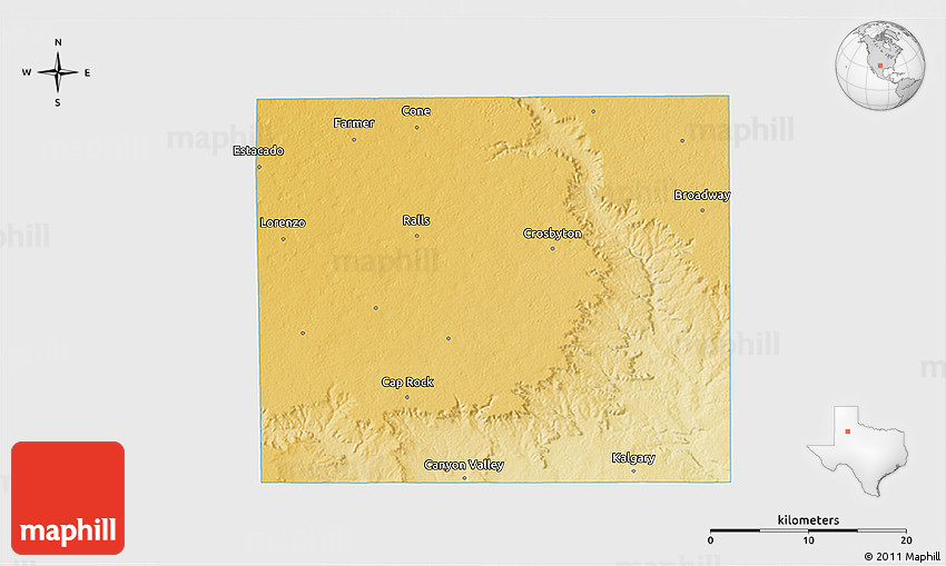 Physical map illustrates the mountains, lowlands, oceans, lakes and rivers and other physical landscape features of Crosby County. Differences in land elevations relative to the sea level are represented by color.
