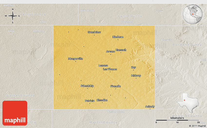 The 3D physical map represents one of several map types and styles available. Look at Dawson County, Texas, United States from different perspectives.