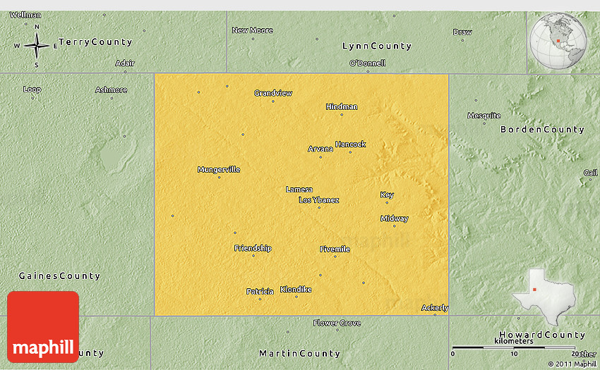 The 3D savanna style map represents one of several map types and styles available. Look at Dawson County, Texas, United States from different perspectives.