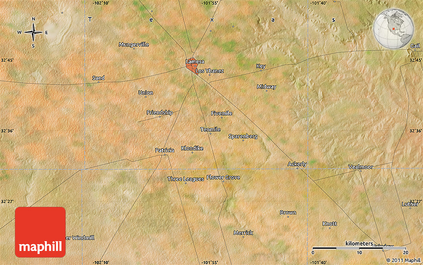 The flat satellite map represents one of many map types available. Look at Key, Dawson County, Texas, United States from different perspectives.