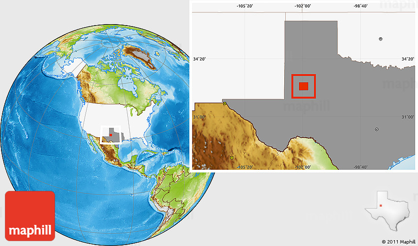 Maphill is a collection of map images. This image combines a physical map with the globe centered on Dawson County. Use the buttons under the image to switch to different map types.