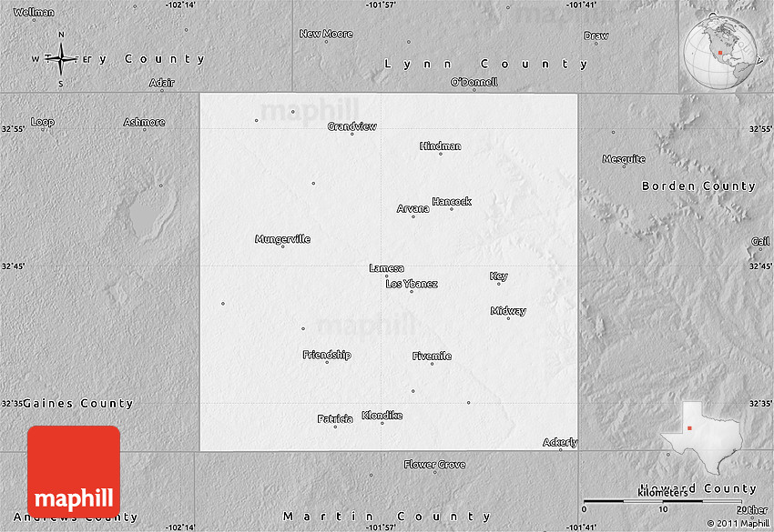The flat gray map represents one of several map types and styles available. Look at Dawson County, Texas, United States from different perspectives.