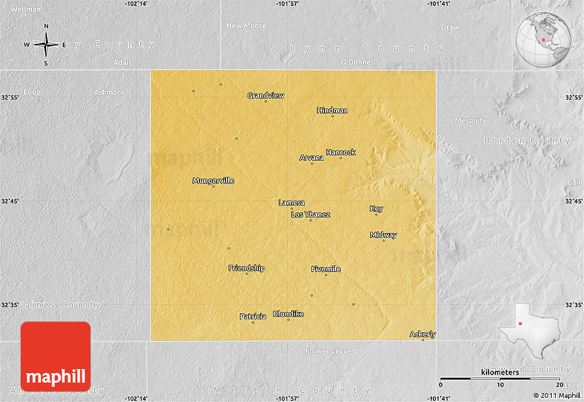 The flat physical map represents one of several map types and styles available. Look at Dawson County, Texas, United States from different perspectives.