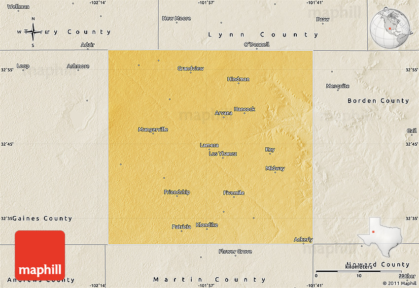 The flat physical map represents one of several map types and styles available. Look at Dawson County, Texas, United States from different perspectives.