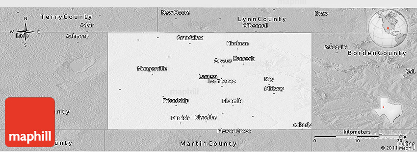 The panoramic gray map represents one of several map types and styles available. Look at Dawson County, Texas, United States from different perspectives.
