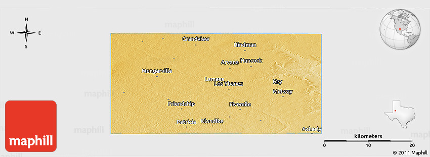 The panoramic physical map represents one of several map types and styles available. Look at Dawson County, Texas, United States from different perspectives.