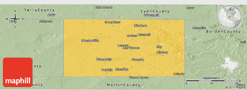 The panoramic savanna style map represents one of several map types and styles available. Look at Dawson County, Texas, United States from different perspectives.
