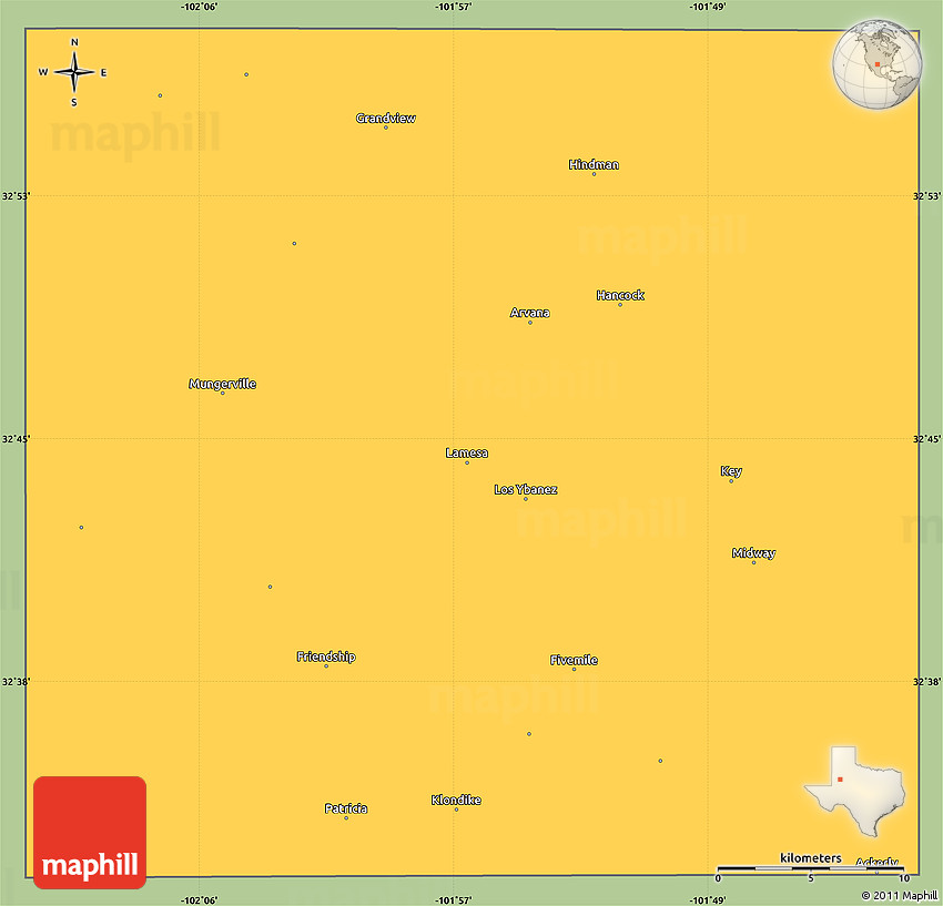 The simple savanna style outline map represents one of several map types and styles available. Look at Dawson County, Texas, United States from different perspectives.
