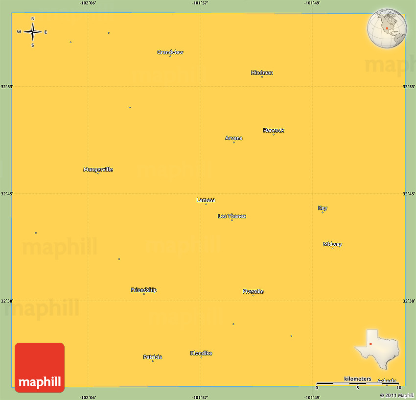 The simple savanna style outline map represents one of several map types and styles available. Look at Dawson County, Texas, United States from different perspectives.