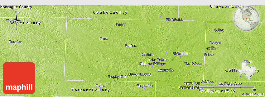 Physical map illustrates the mountains, lowlands, oceans, lakes and rivers and other physical landscape features of Denton County. Differences in land elevations relative to the sea level are represented by color.