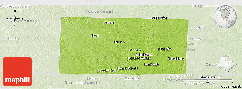 Each map type offers different information and each map style is designed for a different purpose. Read about the styles and map projection used in the above map (Physical Panoramic Map of Denton County, lighten).