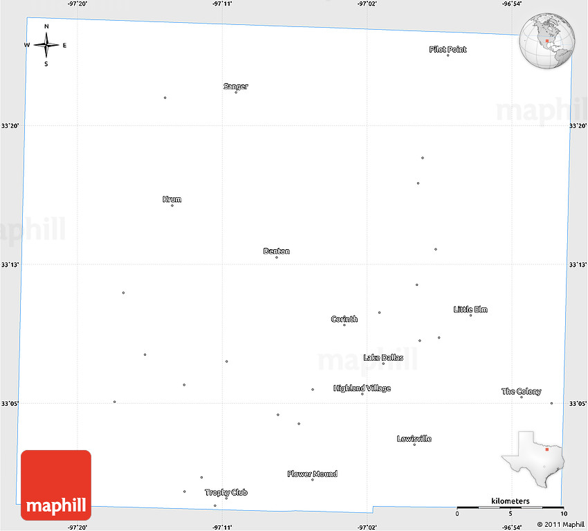 The simple silver style outline map represents one of several map types and styles available. Look at Denton County, Texas, United States from different perspectives.