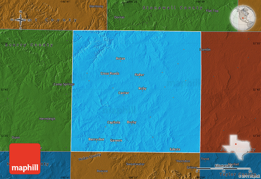 The flat political map represents one of several map types and styles available. Look at Fisher County, Texas, United States from different perspectives.