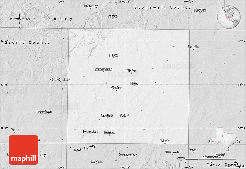 The flat silver style map represents one of several map types and styles available. Look at Fisher County, Texas, United States from different perspectives.