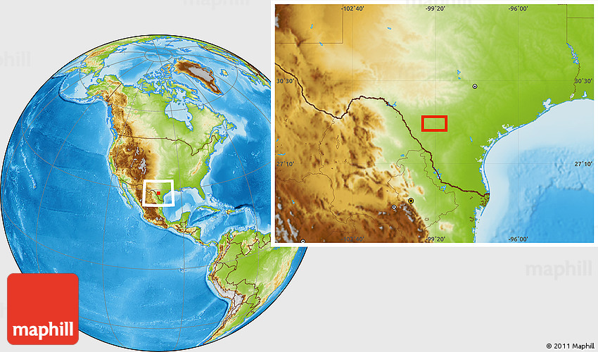 Maphill is a collection of map images. This image combines a physical map with the globe centered on Derby Colonia. Use the buttons under the image to switch to different map types.