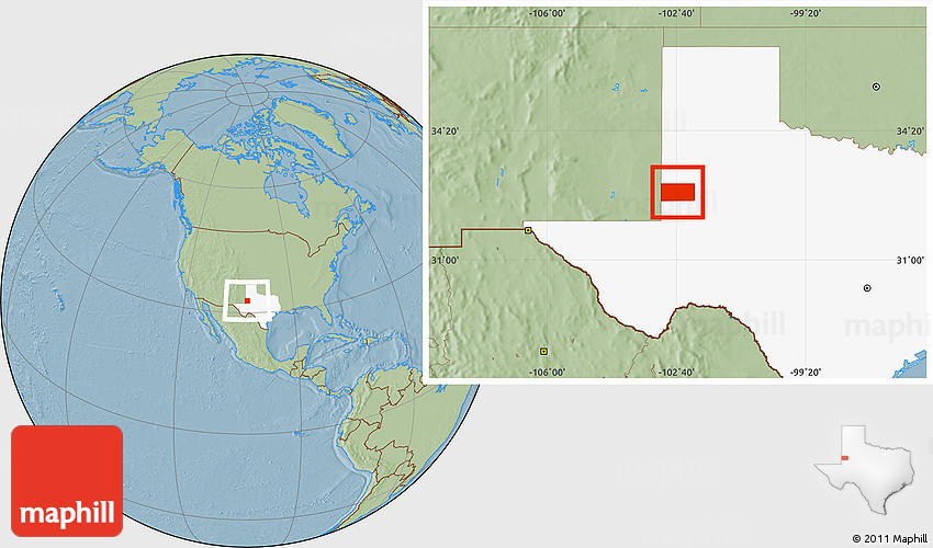 The location map of Gaines County combines two projections: the orthographic azimuthal projection for the globe and the simple geographic projection for the rectangular part of the map. Geographic projection has straight meridians and parallels, each degree of latitude and longitude is the same size over the entire world map.