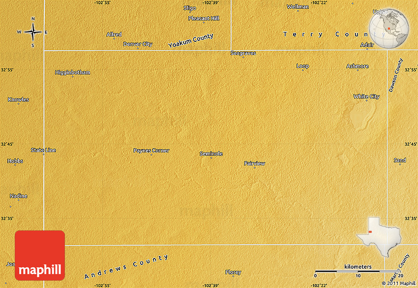 The flat physical map represents one of several map types and styles available. Look at Gaines County, Texas, United States from different perspectives.