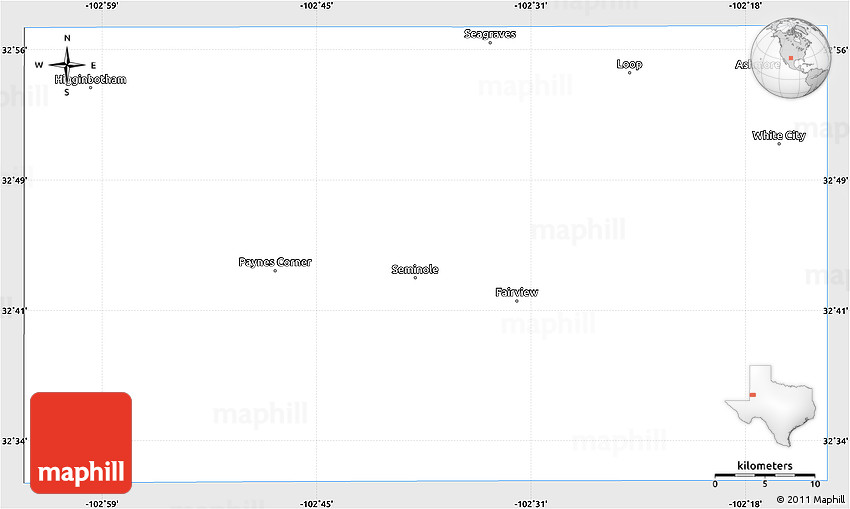 The simple silver style outline map represents one of several map types and styles available. Look at Gaines County, Texas, United States from different perspectives.