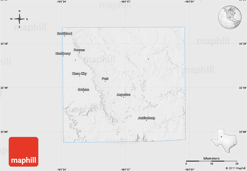 The flat silver style map represents one of several map types and styles available. Look at Garza County, Texas, United States from different perspectives.