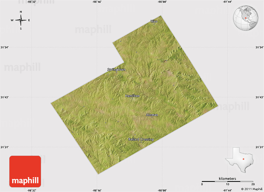 The flat satellite map represents one of several map types and styles available. Look at Hamilton County, Texas, United States from different perspectives.