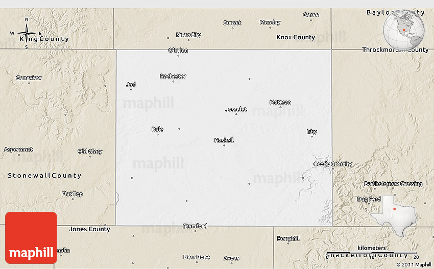 This map uses colors of vintage antique maps. Haskell County is highlighted with white. The rest of the map is beige colored shaded relief map.
