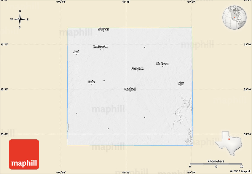 The flat classic style map represents one of several map types and styles available. Look at Haskell County, Texas, United States from different perspectives.