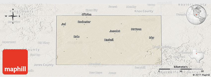 The panoramic shaded relief map represents one of several map types and styles available. Look at Haskell County, Texas, United States from different perspectives.