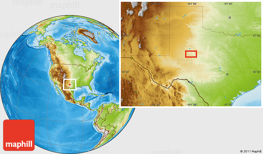 Maphill is a collection of map images. This image combines a physical map with the globe centered on Otis Chalk. Use the buttons under the image to switch to different map types.