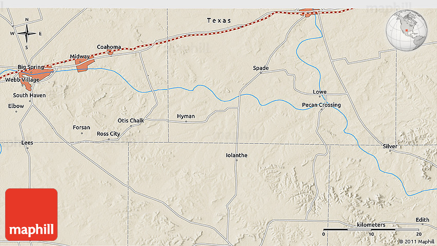 The 3D shaded relief map represents one of many map types and styles available. Look at Sand Springs, Howard County, Texas, United States from different perspectives.