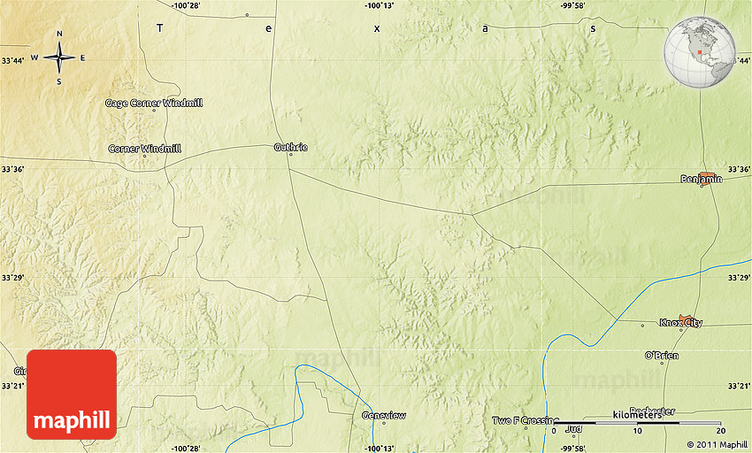 The flat physical map represents one of many map types available. Look at Corner Windmill, King County, Texas, United States from different perspectives.