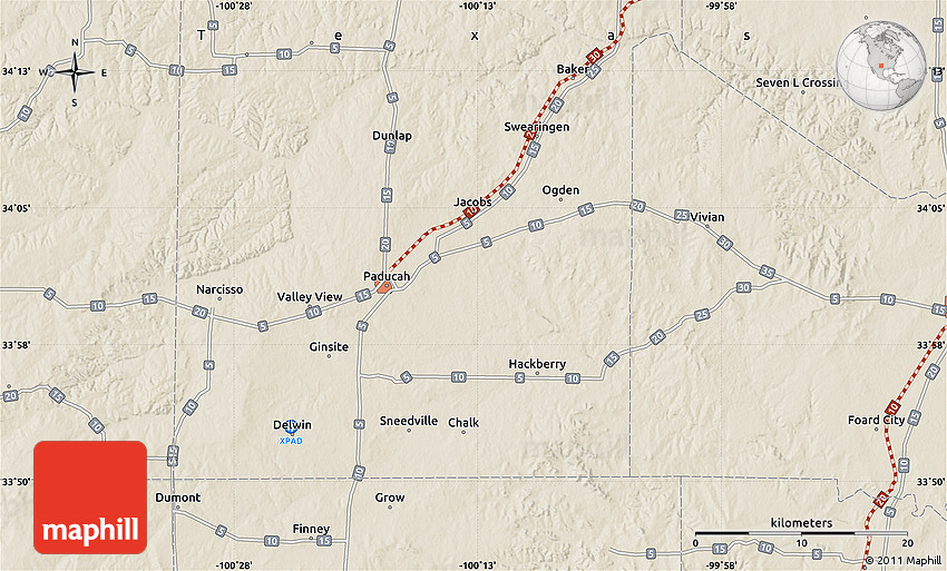 The flat shaded relief map represents one of many map types available. Look at Dumont, King County, Texas, United States from different perspectives.