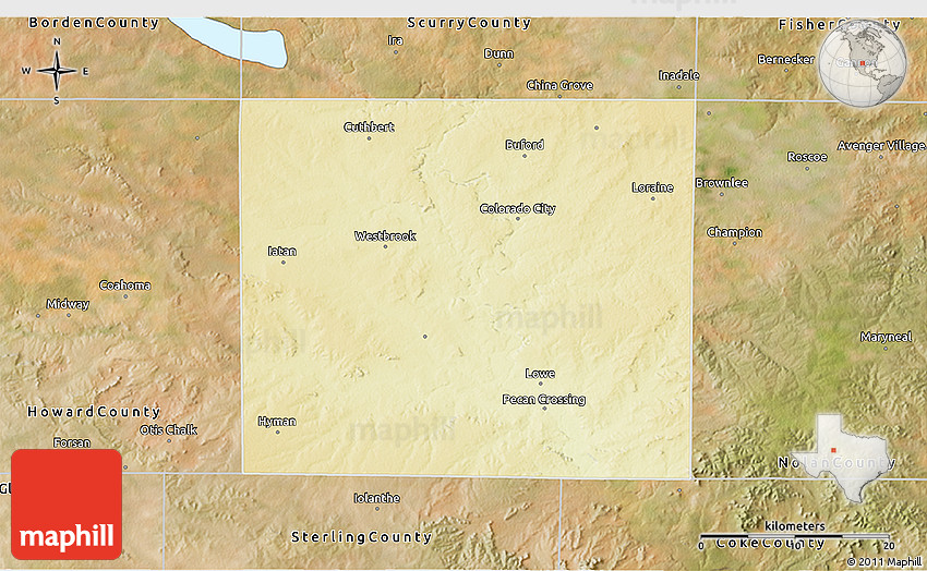 The 3D physical map represents one of several map types and styles available. Look at Mitchell County, Texas, United States from different perspectives.