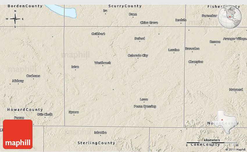 The 3D shaded relief map represents one of several map types and styles available. Look at Mitchell County, Texas, United States from different perspectives.
