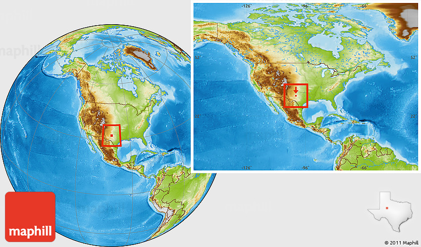 Maphill is a collection of map images. This image combines a physical map with the globe centered on Mitchell County. Use the buttons under the image to switch to different map types.