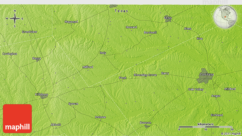 Use the buttons for Facebook, Twitter or Google+ to share a link to this physical map of Corsicana. Maphill is the largest map gallery on the web. The number of maps is, however, not the only reason to visit Maphill.