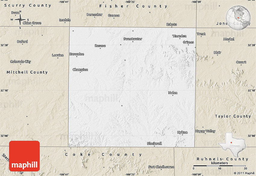 This map uses colors of vintage antique maps. Nolan County is highlighted with white. The rest of the map is beige colored shaded relief map.