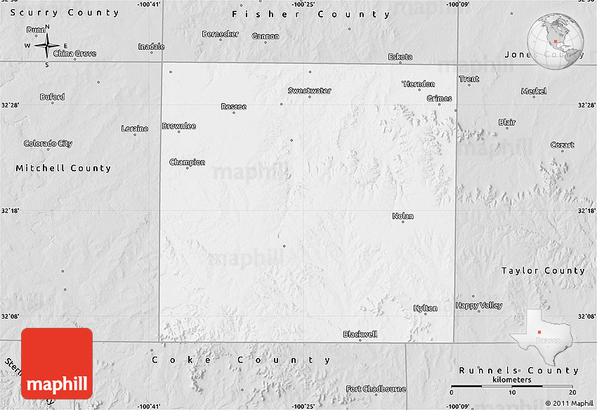 The flat silver style map represents one of several map types and styles available. Look at Nolan County, Texas, United States from different perspectives.