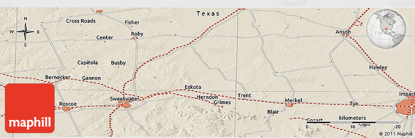 The panoramic shaded relief map represents one of many map types and styles available. Look at Shaufler, Nolan County, Texas, United States from different perspectives.
