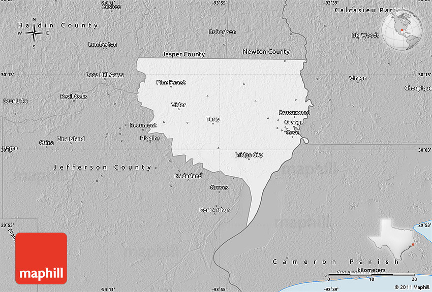 The flat gray map represents one of several map types and styles available. Look at Orange County, Texas, United States from different perspectives.