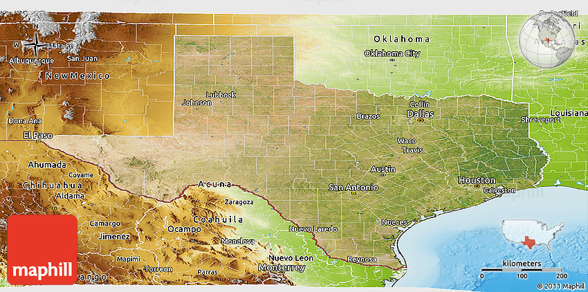 The panoramic satellite map represents one of many map types and styles available. Look at Texas from different perspectives.