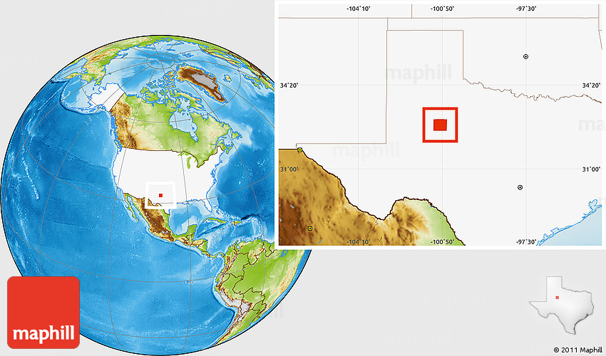 Maphill is a collection of map images. This image combines a physical map with the globe centered on Scurry County. Use the buttons under the image to switch to different map types.