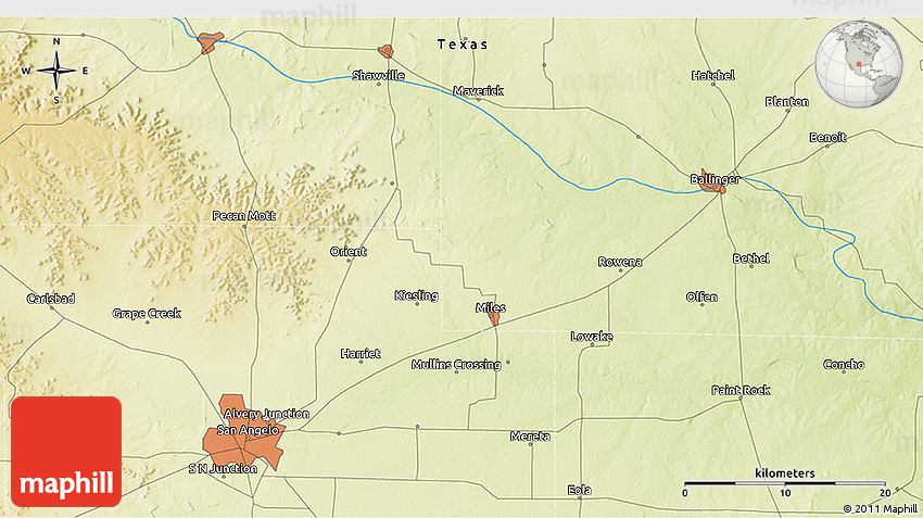 The 3D physical map represents one of many map types and styles available. Look at Kiesling, Tom Green County, Texas, United States from different perspectives.