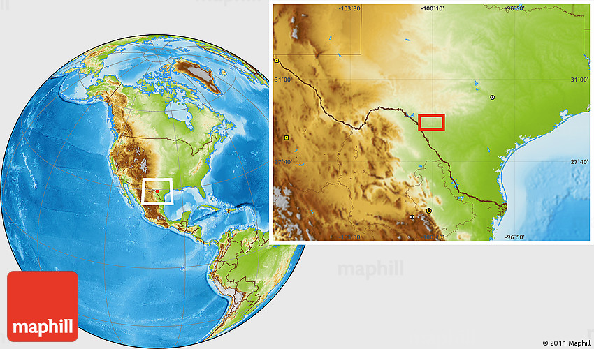 Maphill is a collection of map images. This image combines a physical map with the globe centered on Gonzales Colonia. Use the buttons under the image to switch to different map types.