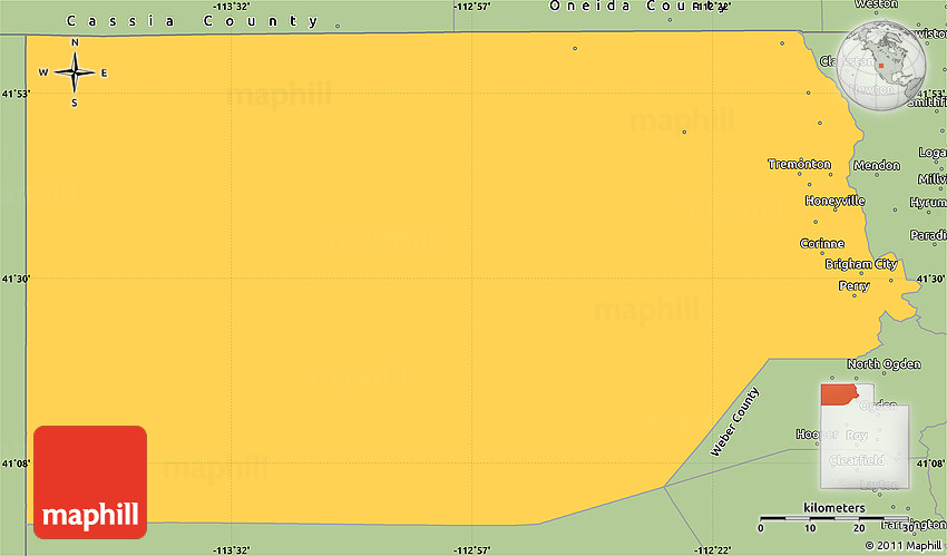 The simple savanna style outline map represents one of several map types and styles available. Look at Box Elder County, Utah, United States from different perspectives.
