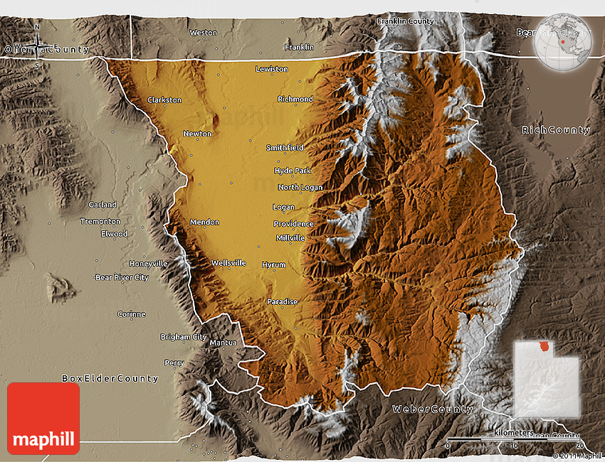 Physical map illustrates the mountains, lowlands, oceans, lakes and rivers and other physical landscape features of Cache County. Differences in land elevations relative to the sea level are represented by color.