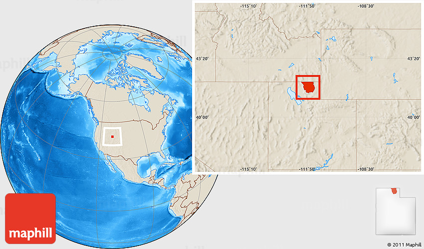 Maphill is a collection of map images. This image combines a shaded relief map with the globe centered on Cache County. Use the buttons under the image to switch to different map types.