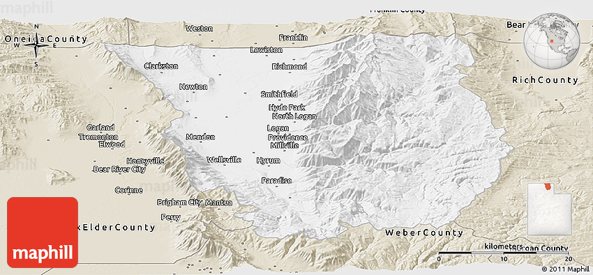 The panoramic classic style map represents one of several map types and styles available. Look at Cache County, Utah, United States from different perspectives.