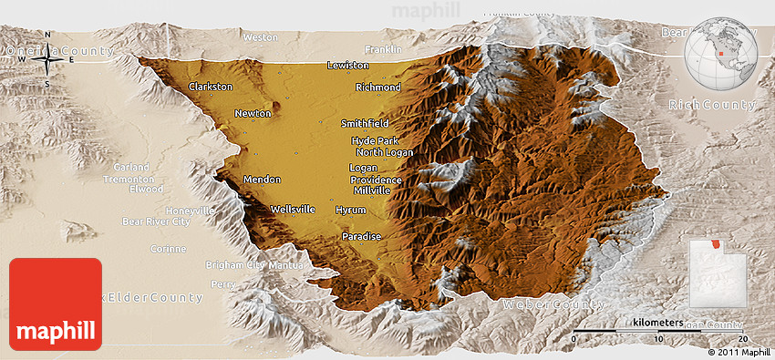 The panoramic physical map represents one of several map types and styles available. Look at Cache County, Utah, United States from different perspectives.
