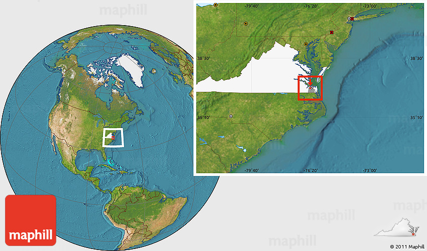 Maphill is a collection of map images. This image combines a satellite map with the globe centered on ZIP code 23701. Use the buttons under the image to switch to different map types.