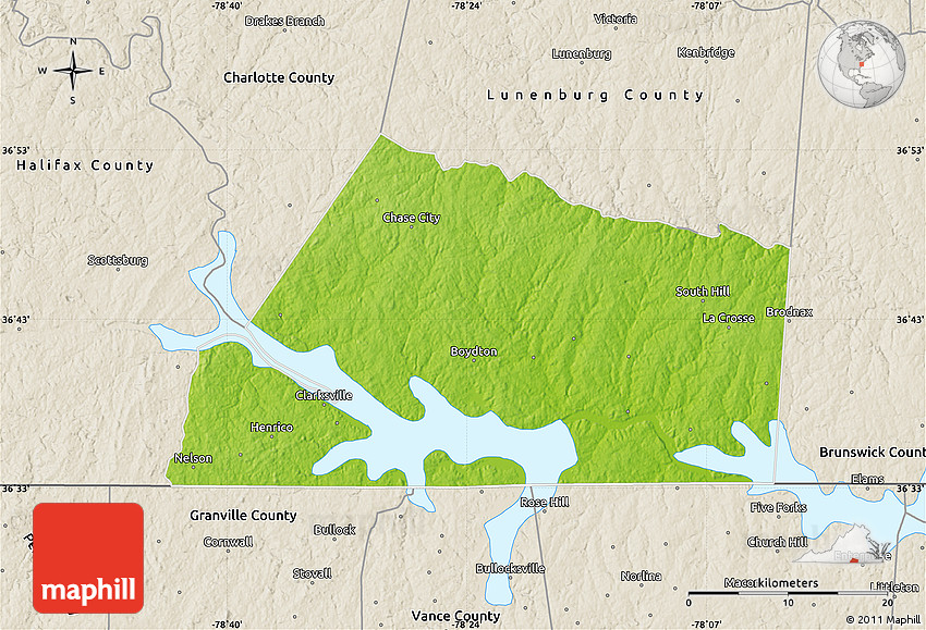The flat physical map represents one of several map types and styles available. Look at Mecklenburg County, Virginia, United States from different perspectives.